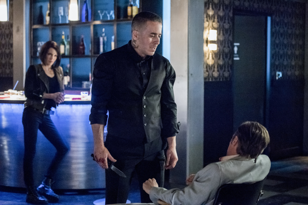 Arrow -- "The Dragon" -- Image Number: AR619a_0272.jpg -- Pictured (L-R): Katie Cassidy as Laurel/Black Siren, Kirk Acevedo as Ricardo Diaz and Ashton Holmes as Eric Cartier -- Photo: Dean Buscher/The CW -- © 2018 The CW Network, LLC. All rights reserved.
